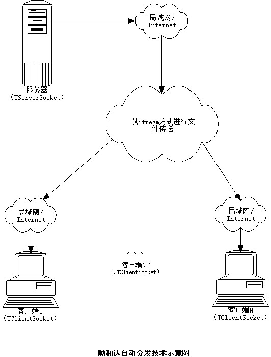 ·自動分發(fā):當服務(wù)器端版本升級后,客戶端登陸后自動得到服務(wù)器端分發(fā)。讓遠在全球的客戶端自動得到版本升級,使整個管理系統(tǒng)版本一致。(技術(shù)示意圖)