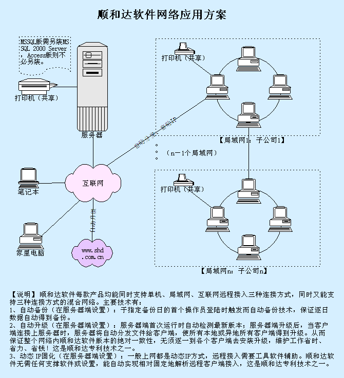 順和達(dá)軟件網(wǎng)絡(luò)應(yīng)用技術(shù)1、單機應(yīng)用:任何能運行winxp的電腦,每款順和達(dá)軟件Access或MSSQL版均可正常運行。正常情況下,MSSQL版記帳、查詢及統(tǒng)計速度會快很多。